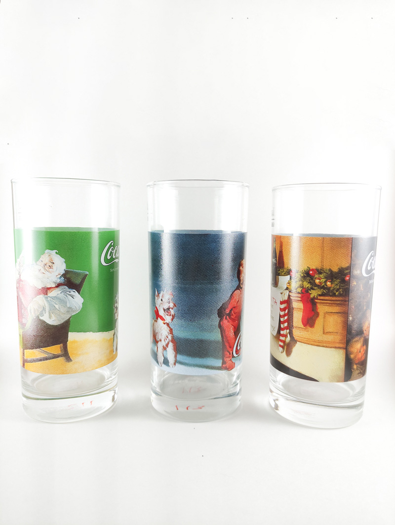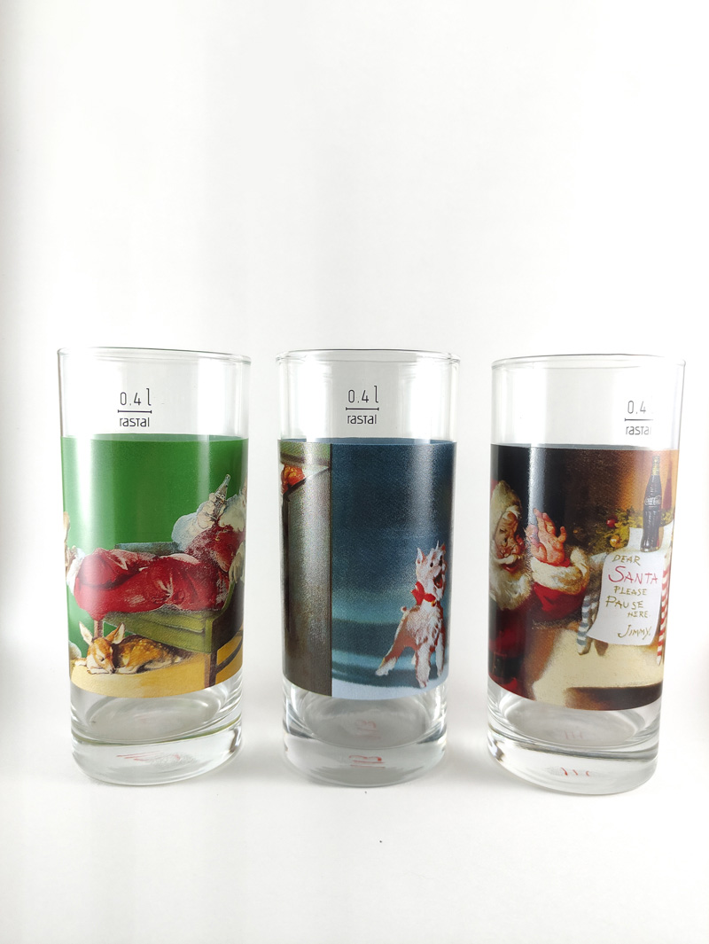 1. Pai Natal sentado com uma garrafa de coca-cola na mão; cão a olhar para o pai natal.